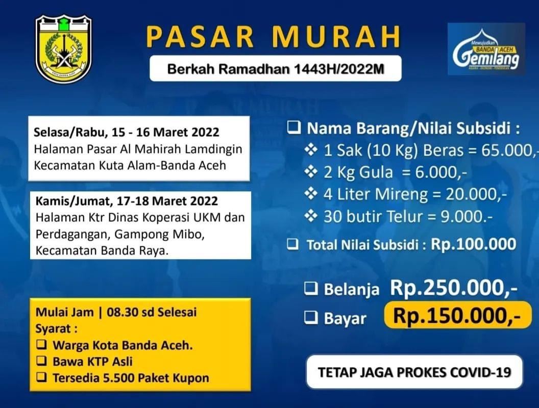 Banda Aceh – Dalam rangka menjaga stabilitas harga bahan pokok menjelang Ramadhan 1443 Hijriah dan membantu masyarakat di masa pandemi Covid-19, Pemerintah Kota Banda Aceh melalui Dinas Koperasi UKM dan Perdagangan Kota kembali akan menggelar pasar murah.