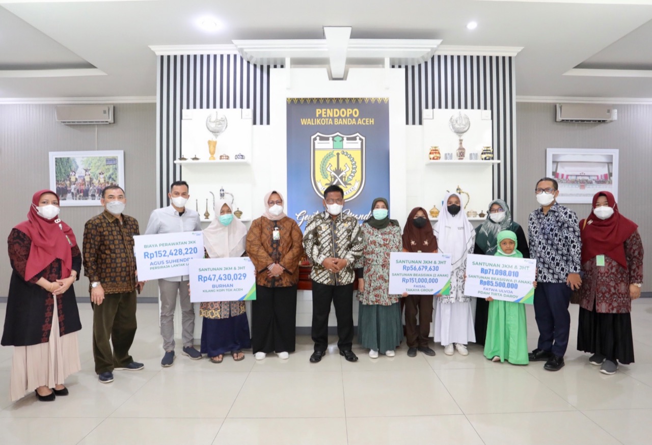 Banda Aceh – Wali Kota Banda Aceh Aminullah Usman menyerahkan secara simbolis santuan uang duka (jaminan kematian), hari tua, beasiswa, dan kecelakaan kerja dari Badan Penyelenggara Jaminan Sosial (BPJS) Ketenagakerjaan kepada empat penerima/ahli waris di pendopo, Kamis 10 Maret 2022.