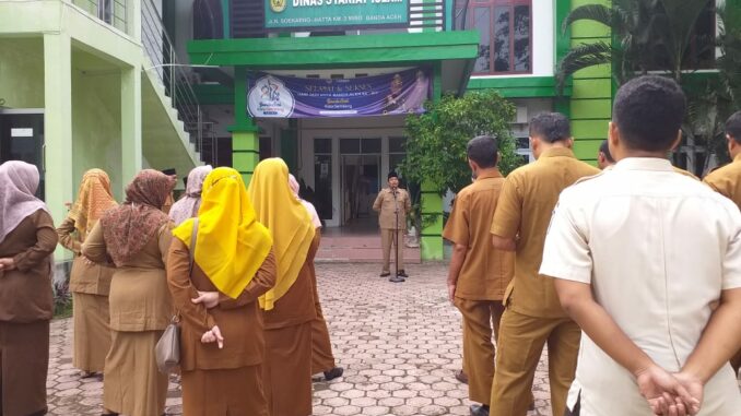 Banda Aceh – Plt Kepala Dinas Syariat Islam (DSI) Kota Banda Aceh, Ridwan SAg MPd memimpin langsung apel pagi perdana pasca libur lebaran Idul Fitri 1443 H. Senin (9/5).