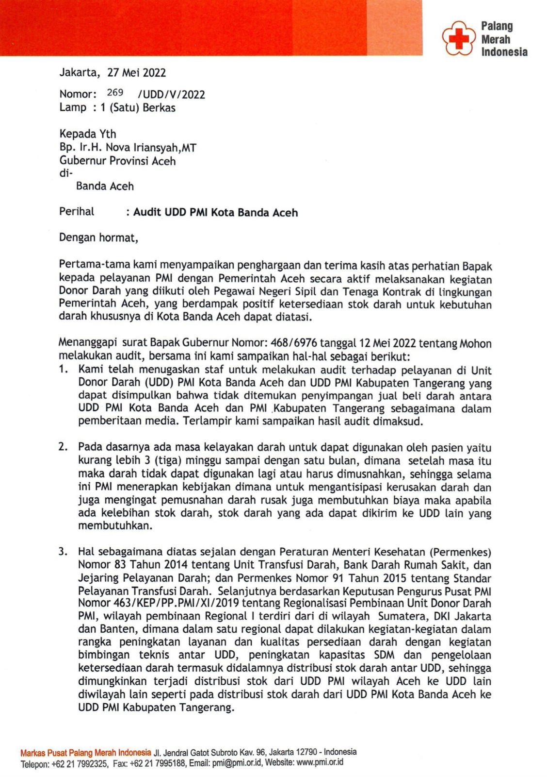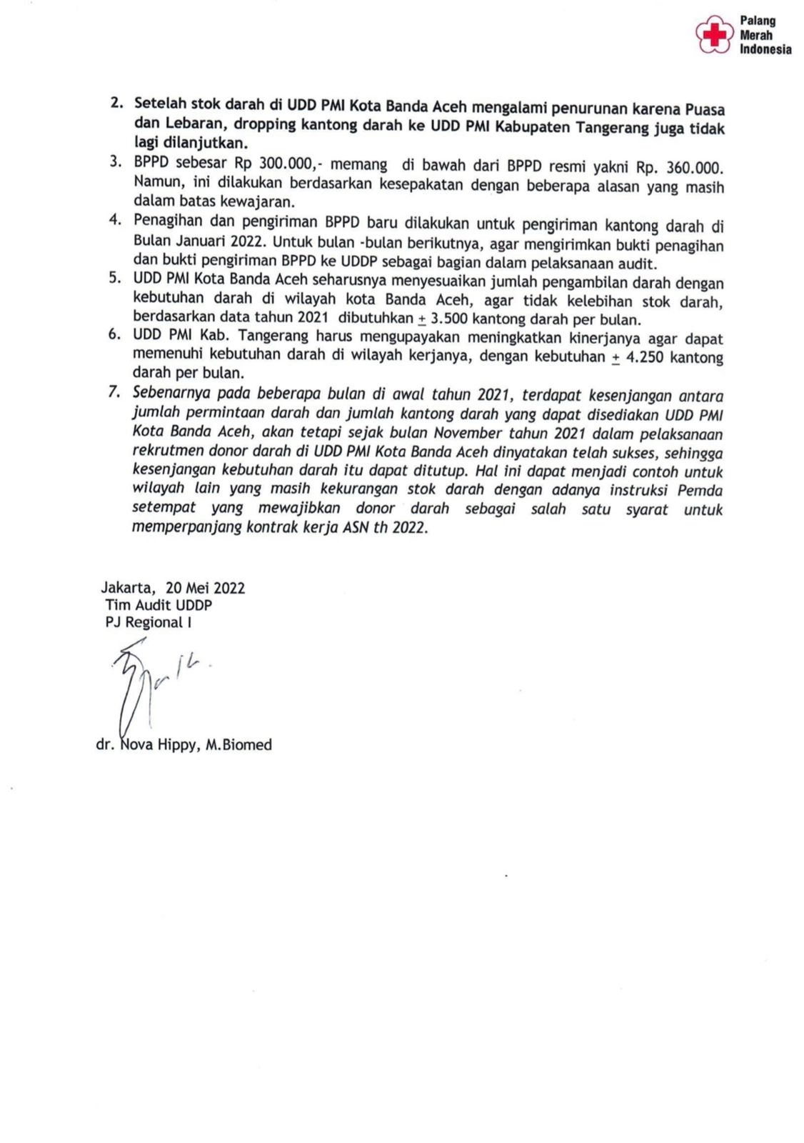 Ia berterima kasih kepada Pemerintah Aceh yang telah menginisiasi gerakan ASN berdonor dan selama ini sudah percaya dengan PMI Kota Banda Aceh sebagai mitra. Ia berharap ASN bisa kembali donor di PMI Kota Banda Aceh karena hasil audit dari PMI Pusat menunjukkan bahwa PMI Kota Banda Aceh tidak terbukti melakukan kesalahan terkait alih distribusi darah dan hasil audit UDDP Sebenarnya pada beberapa bulan di awal tahun 2021, terdapat kesenjangan antara jumlah permintaan darah dan jumlah kantong darah yang dapat disediakan UDD PMI Kota Banda Aceh, akan tetapi sejak bulan November tahun 2021 dalam pelaksanaan rekrutmen donor darah di UDD PMI Kota Banda Aceh dinyatakan telah sukses, sehingga kesenjangan darah itu dapat ditutup. Hal ini dapat menjadi contoh untuk wilayah lain yang masih kekurangan stok darah dengan adanya instruksi Pemda setempat yang mewajibkan donor darah sebagai salah satu syarat untuk memperpanjang kontrak kerja ASN tahun 2022,” papar PMI Pusat, diakhir suratnya.