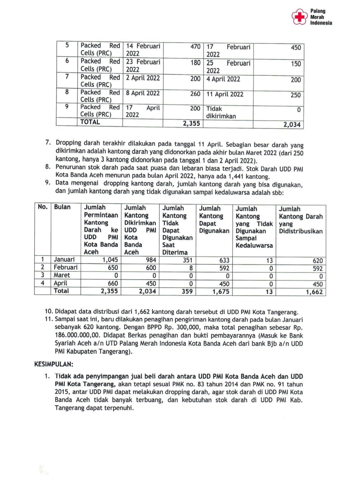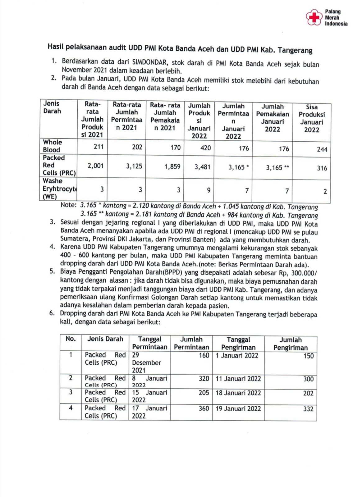 “Kami telah menugaskan staf untuk melakukan audit terhadap pelayanan di UDD PMI Kota Banda Aceh dan UDD PMI Kabupaten Tangerang, yang dapat disimpulkan bahwa tidak ditemukan penyimpangan alih distribusi darah antara UDD PMI Kota Banda Aceh dan UDD PMI Kabupaten Tangerang sebagaimana pemberitaan media,” tulis Jusuf Kalla.