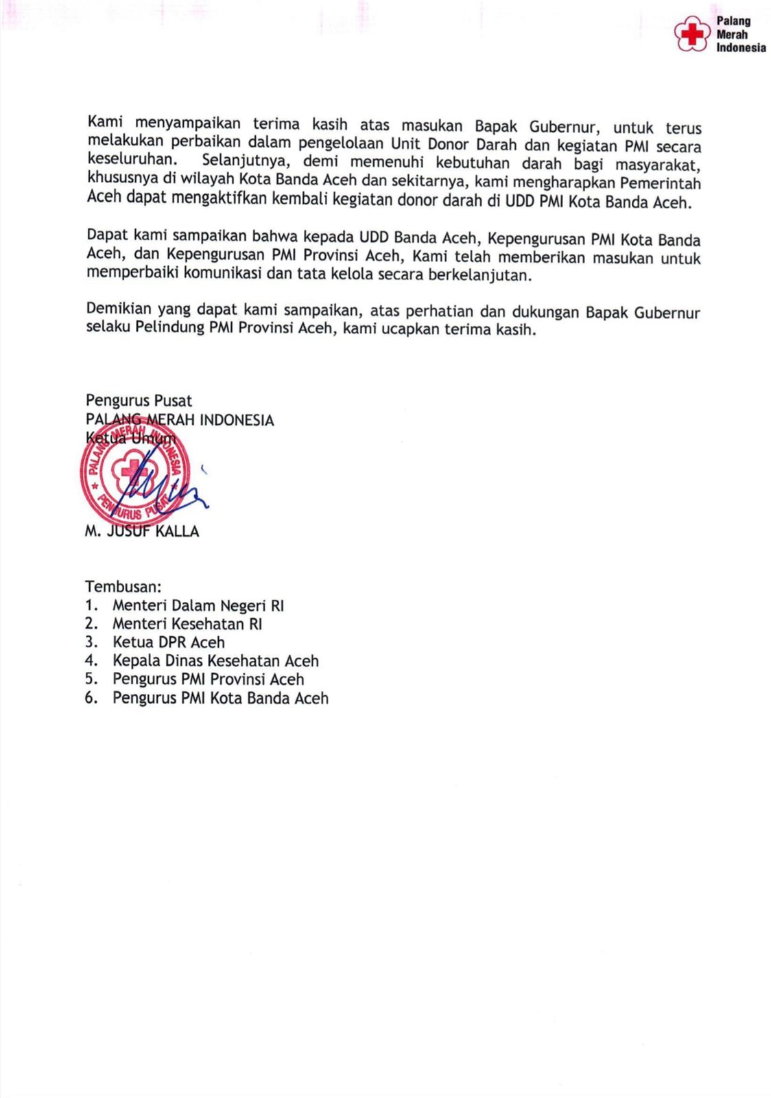 Dalam surat itu, Jusuf Kalla menyampaikan beberapa hal terkait indikasi jual-beli darah oleh UDD PMI Kota Banda Aceh ke UDD PMI Kabupaten Tangerang. Sebelumnya Gubernur Aceh mengirimkan surat ke PMI Pusat agar dilakukan audit terhadap PMI Kota Banda Aceh.