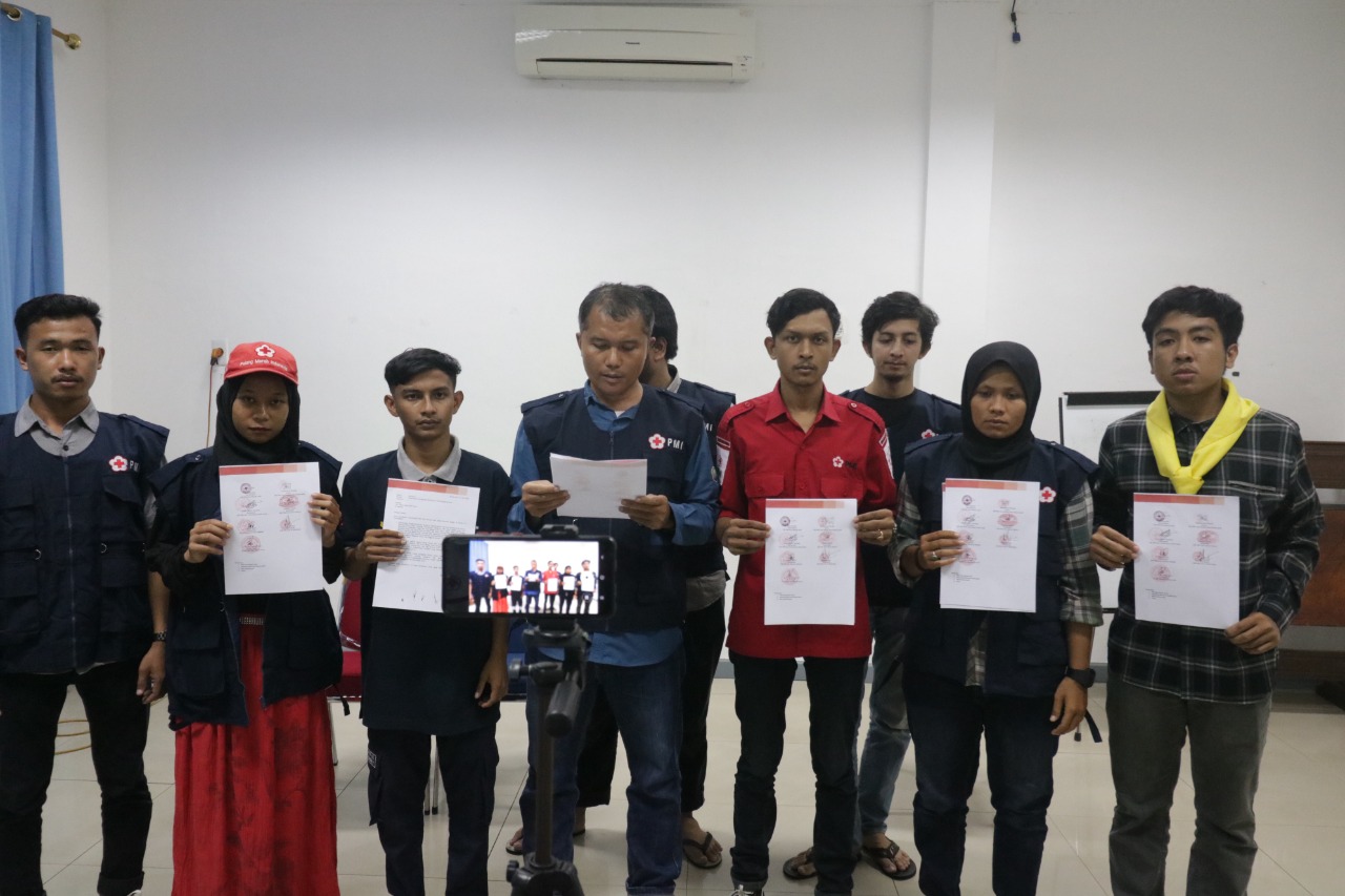 Banda Aceh – Unit relawan PMI se-Banda Aceh, yaitu KSR Unit Markas, KSR Unit Perguruan Tinggi, Forpis, dan TSR, memberikan pernyataan sikap menolak pembekuan Pengurus PMI Kota Banda Aceh yang dilakukan PMI Provinsi Aceh pada Senin, 27 Juni 2022.