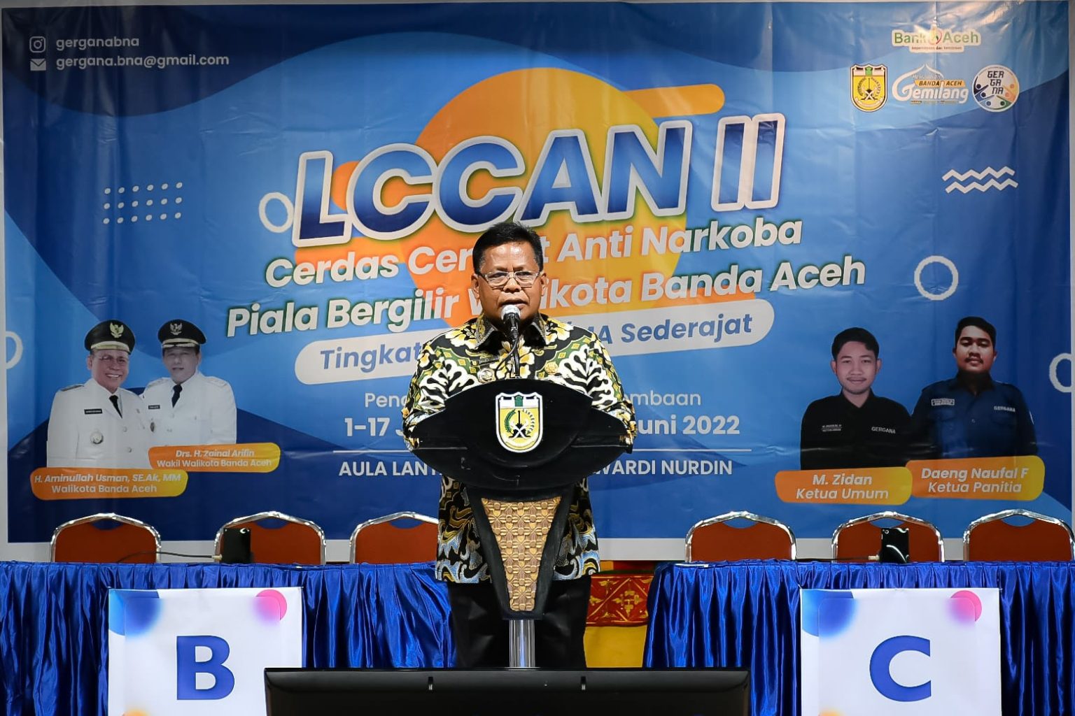 Banda Aceh – Wali Kota Banda Aceh Aminullah Usman apresiasi kepada Generasi Gemilang Anti Narkoba (GERGANA) Kota Banda Aceh yang melaksanakan Cerdas Cermat Anti Narkoba II Piala Bergilir Wali Kota Banda Aceh Tahun 2022, yang berlangsung di Aula Mawardy Nurdin, Balai Kota, Rabu (22/06).