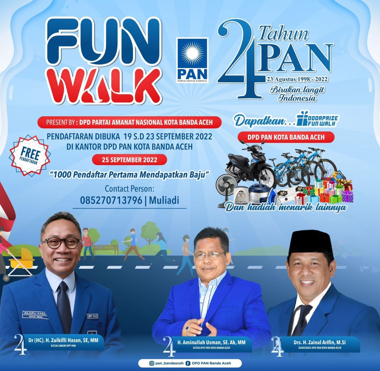 Banda Aceh – DPD Partai Amanat Nasional (PAN) Kota Banda Aceh akan menggelar Fun Walk (Jalan santai), Bazaar UMKM dan Instagram Photo Contest yang merupakan rangkaian penutup seluruh kegiatan dalam memeriahkan HUT PAN Ke-24 di Kota Banda Aceh.