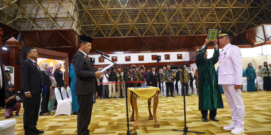 Banda Aceh – Penjabat Gubernur Aceh Achmad Marzuki, mengambil sumpah dan melantik Reza Fahlevi sebagai Pj Wali Kota Sabang, di Anjong Mon Mata komplek Meuligoe Gubernur Aceh, Senin (19/9/2022).