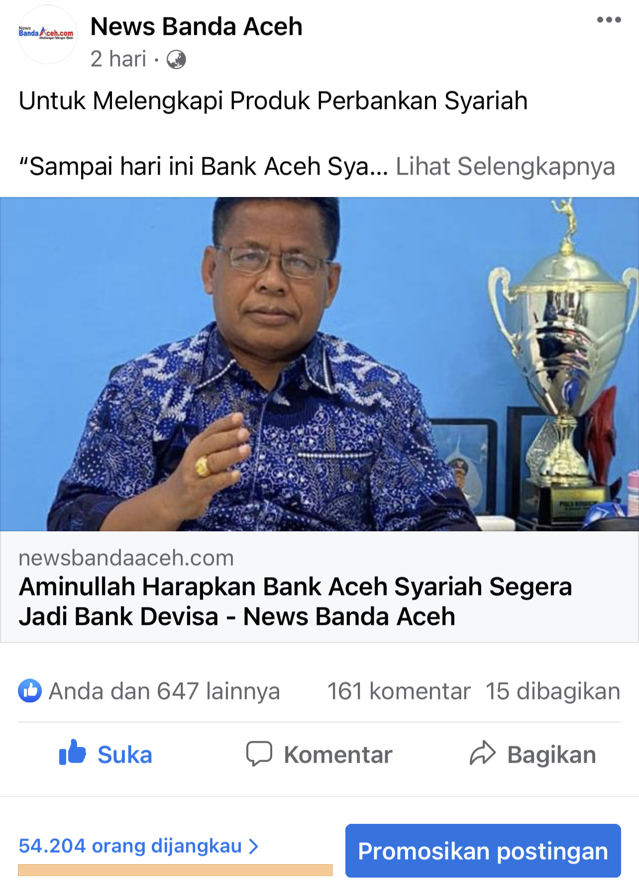 Betapa tidak, dalam dua hari berita berjudul “Aminullah Harapkan Bank Aceh Syariah Segera Jadi Bank Devisa” yang dimuat NBA pada 31 Agustus 2022 dan dibagikan di Fanpage Facebook News Banda Aceh sudah dijangkau oleh 54.204 orang, 647 menyukai, 161 komentar dan 15 kali dibagikan.