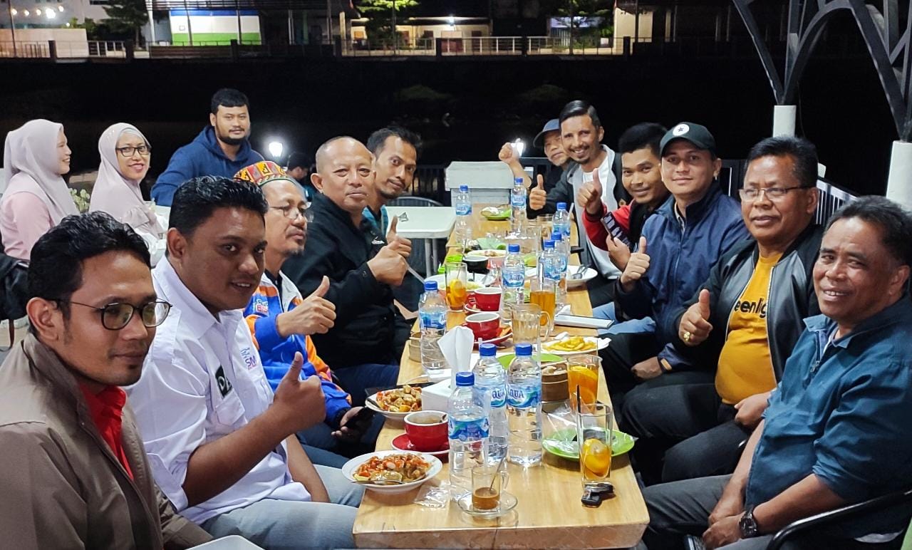 Banda Aceh – Ketua DPD PAN Banda Aceh, H Aminullah Usman SE.Ak MM menikmati kopi dan sajian kuliner bersama wartawan-wartawan senior di warung kopi Solong Jembatan Peunayong (Jepe), Kamis (1/9).