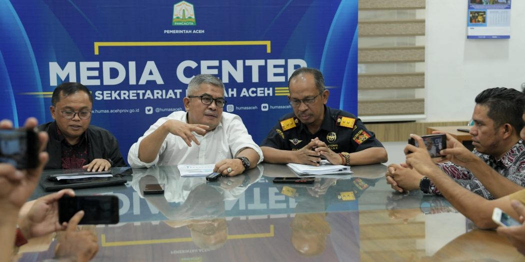 Saat konferensi pers Sekda Aceh turut didampingi oleh Kepala Bank Indonesia Perwakilan Aceh Achris Sarwani dan Kepala Kantor Wilayah Bea Cukai Aceh Safuadi, di Media Center Setda Aceh, Kamis sore.