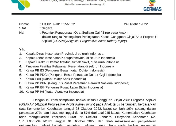 Tenaga kesehatan di fasilitas pelayanan kesehatan (fasyankes) dapat meresepkan 156 obat dengan sediaan cair/sirop. Hal ini tertuang dalam Surat Plt. Direktur Jenderal Pelayanan Kesehatan, Kementerian Kesehatan (Kemenkes), Nomor: HK.02.02/III/3515/2022 tentang Petunjuk Penggunaan Obat Sediaan Cair/Sirup pada Anak dalam rangka Pencegahan Peningkatan Kasus Gangguan Ginjal Akut Progresif Atipikal (GGAPA)/(Atypical Progressive Acute Kidney Injury) yang dikeluarkan pada tanggal 24 Oktober 2022.