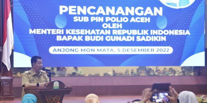 Banda Aceh – Penjabat (Pj) Gubernur Aceh, Achmad Marzuki, mengimbau seluruh Bupati dan Wali Kota se Aceh agar serius melakukan kegiatan Sub Pin Polio di masing-masing daerah. “Tolong kerja sama dengan seluruh unsur Forkopimda, sehingga target 95 persen (sub pin polio) dapat tercapai,” kata Achmad Marzuki saat pencanangan Sub Pekan Imunisasi Nasional (Sub Pin) Polio Aceh oleh Menteri Kesehatan Budi Gunadi Sadikin, Senin 5/12/2022.
