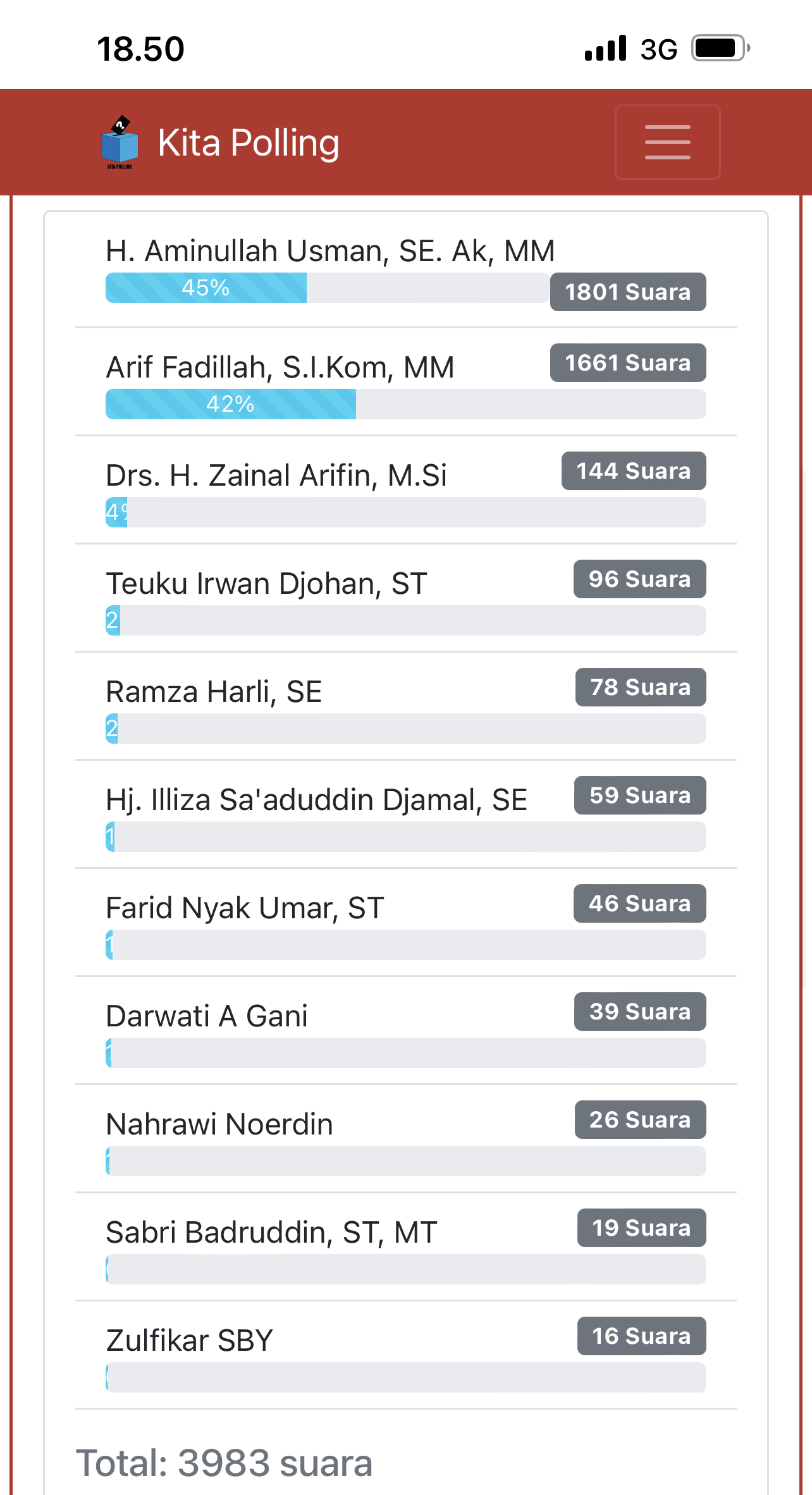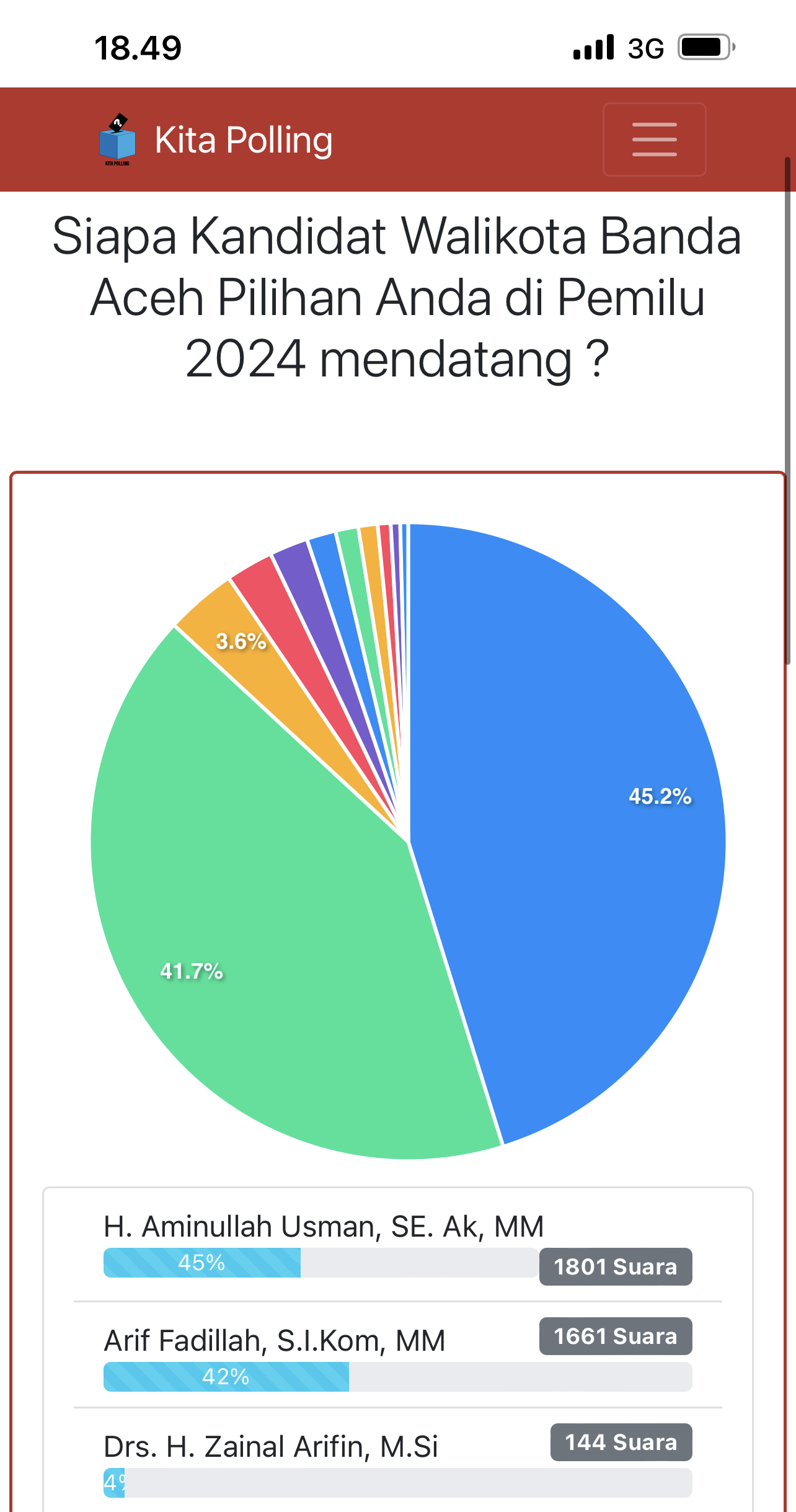Dari 3983 voters pantauan media ini, pada Jumat (30/12) Pukul 18.49 WIB, hasilnya Aminullah Usman berada di posisi teratas dengan meraih 45%, disusul Arif Fadhilah 42%, mantan Wakil Wali Kota Banda Aceh Zainal Arifin 4%, dan nama-nama lainnya yang rata-rata meraih 2%.