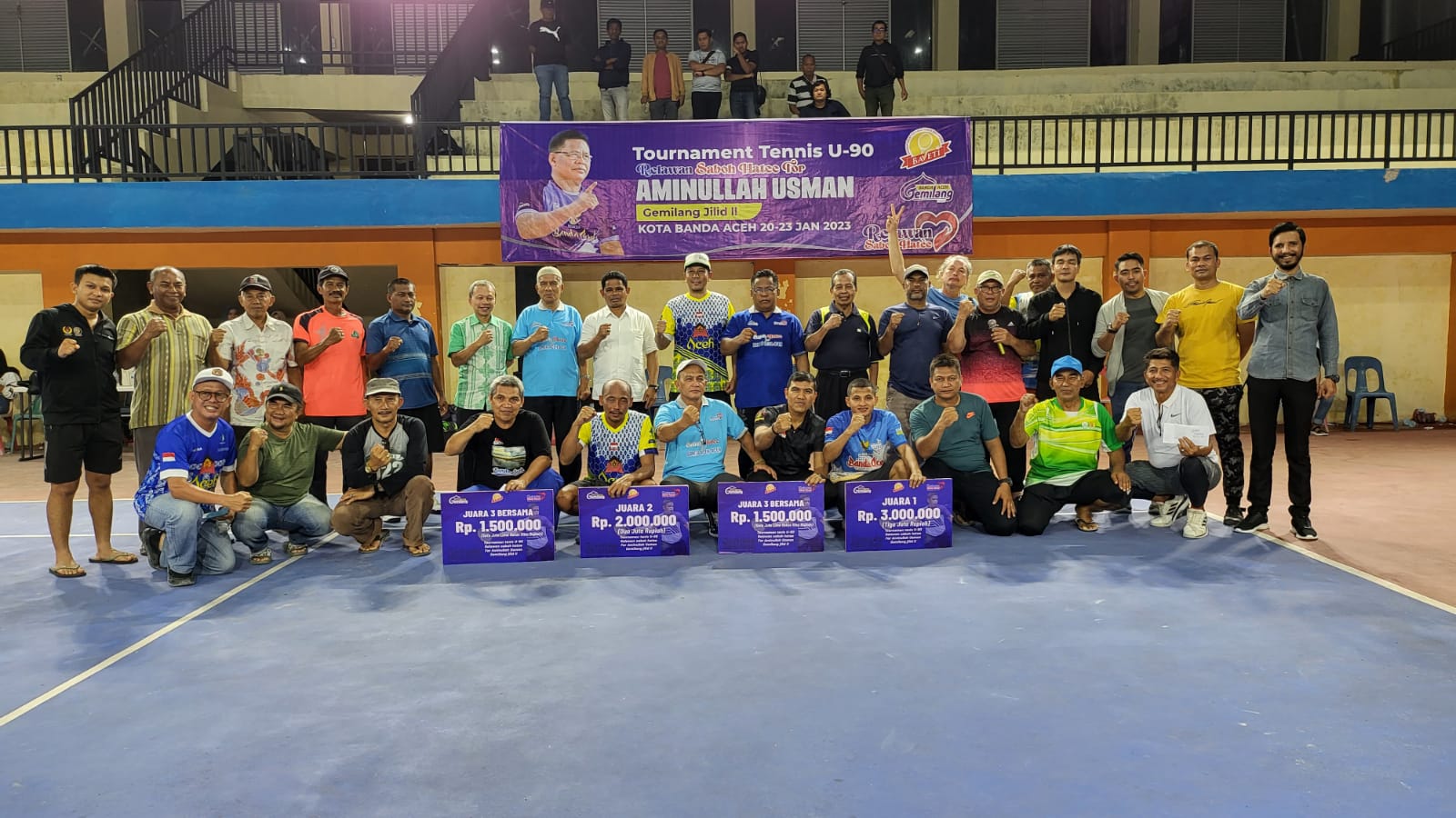 Banda Aceh – Tournament Tenis U-90 Relawan Saboh Hatee For Aminullah Usman Gemilang Jilid II resmi ditutup. Tournament yang berlangsung selama tiga hari ini dijuarai pasangan Aminullah/Lohan setelah berhasil menumbangkan perlawanan Budi/Fredy di partai final yang berlangsung di Lapangan Banda Aceh Sport Centre Blang Oi, Kecamatan Meuraxa, Banda Aceh, Minggu malam (22/1).
