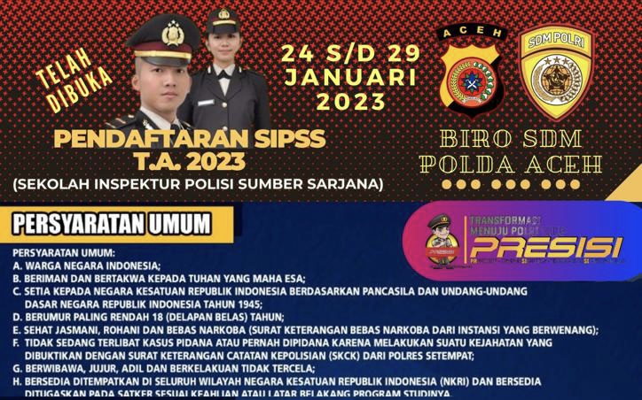 Banda Aceh – Guna menjaring dan meningkatkan animo yang maksimal dalam rangka Penerimaan Polri TA. 2023, Polresta Banda Aceh memasang Spanduk Penerimaan Sekolah Inspektur Polisi Sumber Sarjana (SIPSS) Tahun 2023 di Tempat Keramaian dalam wilayah hukum Polresta Banda Aceh, Selasa (24/1/2023).