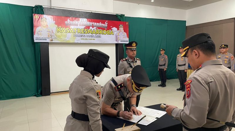 Banda Aceh – Kapolresta Banda Aceh, Kombes Pol Fahmi Irwan Ramli, SH, SIK, M.Si lantik AKP Ferdian Chandra, S. Sos, MH menjadi Kasatresnarkoba Polresta Banda Aceh menggantikan Kompol Tendri Wardi, S.Pt, SIK, M.H.