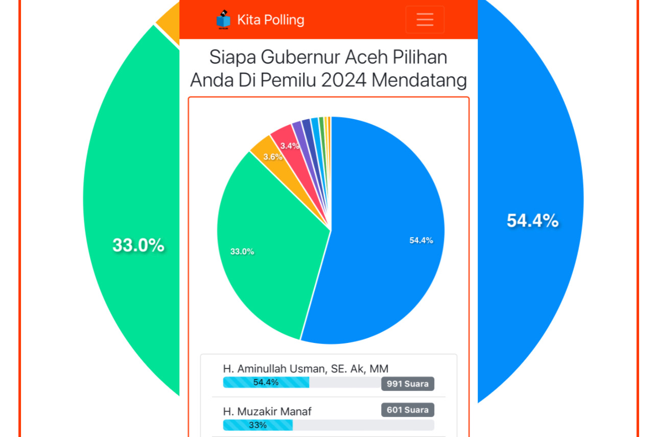 Hingga Pukul 15.53 WIB, polling “Siapa Gubernur Aceh Pilihan Anda Di Pemilu 2024 Mendatang” tersebut sudah menerima 1823 suara. Dan nama Aminullah Usman unggul 54.4% disusul Muhammad Nazar Muzakir Manaf 33%, Nasir Djamil 3,6%, Muhammad Yusuf Bin A Wahab 3,4%, Sudirman 1.4%, Muhammad Nazar 1,3%, Abdullah Puteh 1,2%, Darni Daud 0,8%, Sayed Mustafa Usab 0,5% dan Nurlif 0,5%.