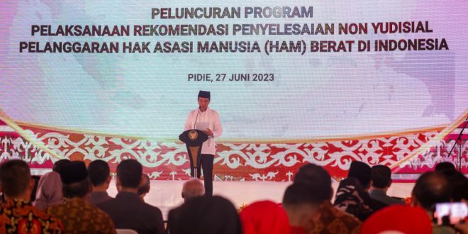 Penegasan tersebut disampaikan oleh Presiden, dalam sambutannya sebelum secara resmi meluncurkan Program Pelaksanaan Rekomendasi Penyelesaian non Yudisial Pelanggaran Hak Asasi Manusia Berat di Indonesia, yang di pusatkan di Rumoh Geudong, Gampong Bili Aron Kecamatan Glumpang Tiga, Selasa (27/6/2023).