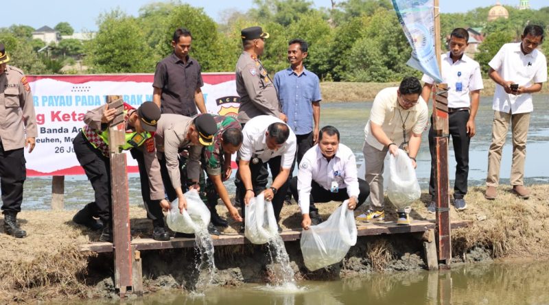 BANDA ACEH – Balai Perikanan Budidaya Air Payau (BPBAP) Ujung Batee bersama Polresta Banda Aceh menyerahkan 7000 benih ikan kepada warga gampong Neuheun, Mesjid Raya, Aceh Besar, Rabu,(26/7/2023) pagi.
