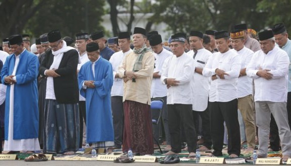 BANDA ACEH – Penjabat (Pj) Gubernur Aceh Achmad Marzuki, bersama Sekretaris Daerah Aceh Bustami Hamzah, melaksanakan Shalat Idul Adha 1444 Hijriah, bersama ribuan jama’ah di Lapangan Blang Padang, Kamis (29/6/2023) pagi.