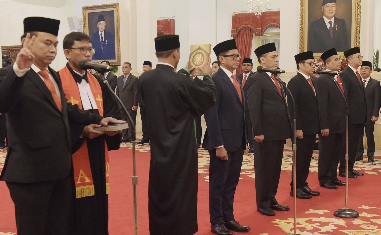 “Saya bersumpah/berjanji bahwa saya akan setia kepada Undang-Undang Dasar Negara Republik Indonesia tahun 1945 serta akan menjalankan segala peraturan perundang-undangan dengan selurus-lurusnya demi darmabakti saya kepada bangsa dan negara. Bahwa saya dalam menjalankan tugas jabatan akan menjunjung tinggi etika jabatan, bekerja dengan sebaik-baiknya, dengan penuh rasa tanggung jawab,” ucap Presiden mendiktekan sumpah jabatan.