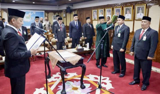 BANDA ACEH – Penjabat Gubernur Aceh Achmad Marzuki, selaku Pemegang Saham Pengendali PT Bank Aceh Syariah, mengambil sumpah dan melantik Numairi sebagai Direktur Kepatuhan dan Zulkarnaini sebagai Direktur Operasional dan Akuntansi PT BAS, periode 2023-2027, di ruang kerja Gubernur Aceh, Selasa (8/8/2023) pagi.