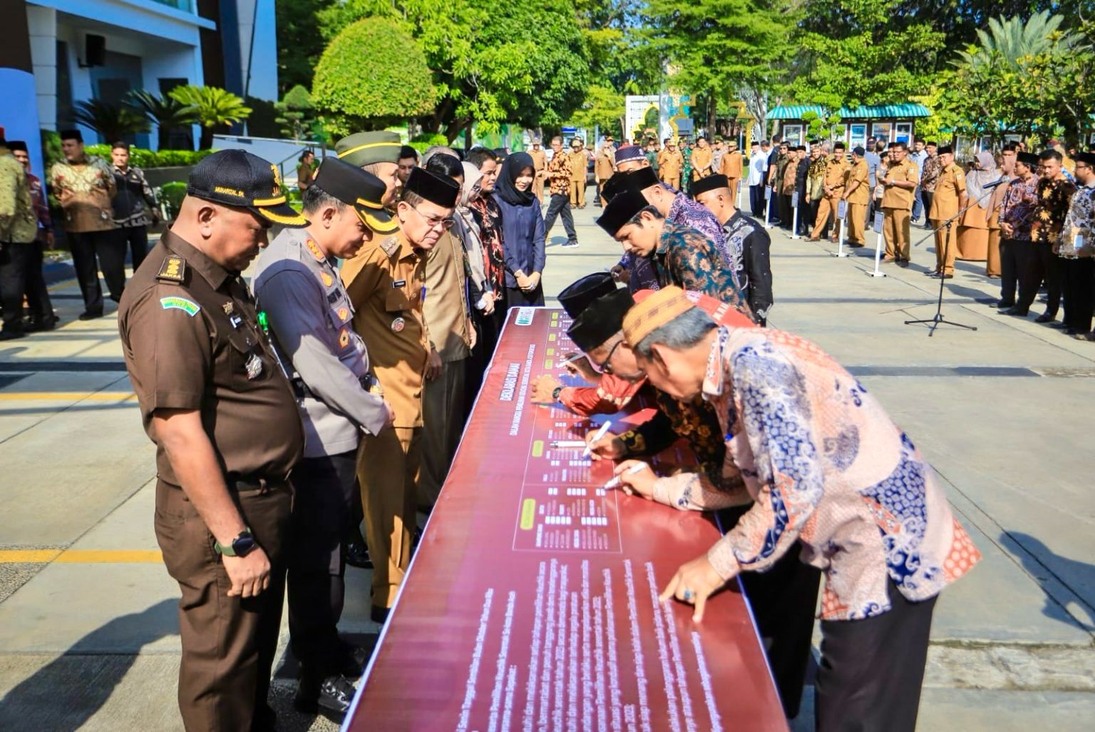 Deklarasi damai ditandai dengan penandatanganan pakta integritas oleh 104 calon keuchik dari 31 gampong yang akan menggelar pilchiksung pada Minggu, 15 Oktober 2023, mendatang. Segenap unsur forkopimda juga turut membubuhkan tanda tangannya.