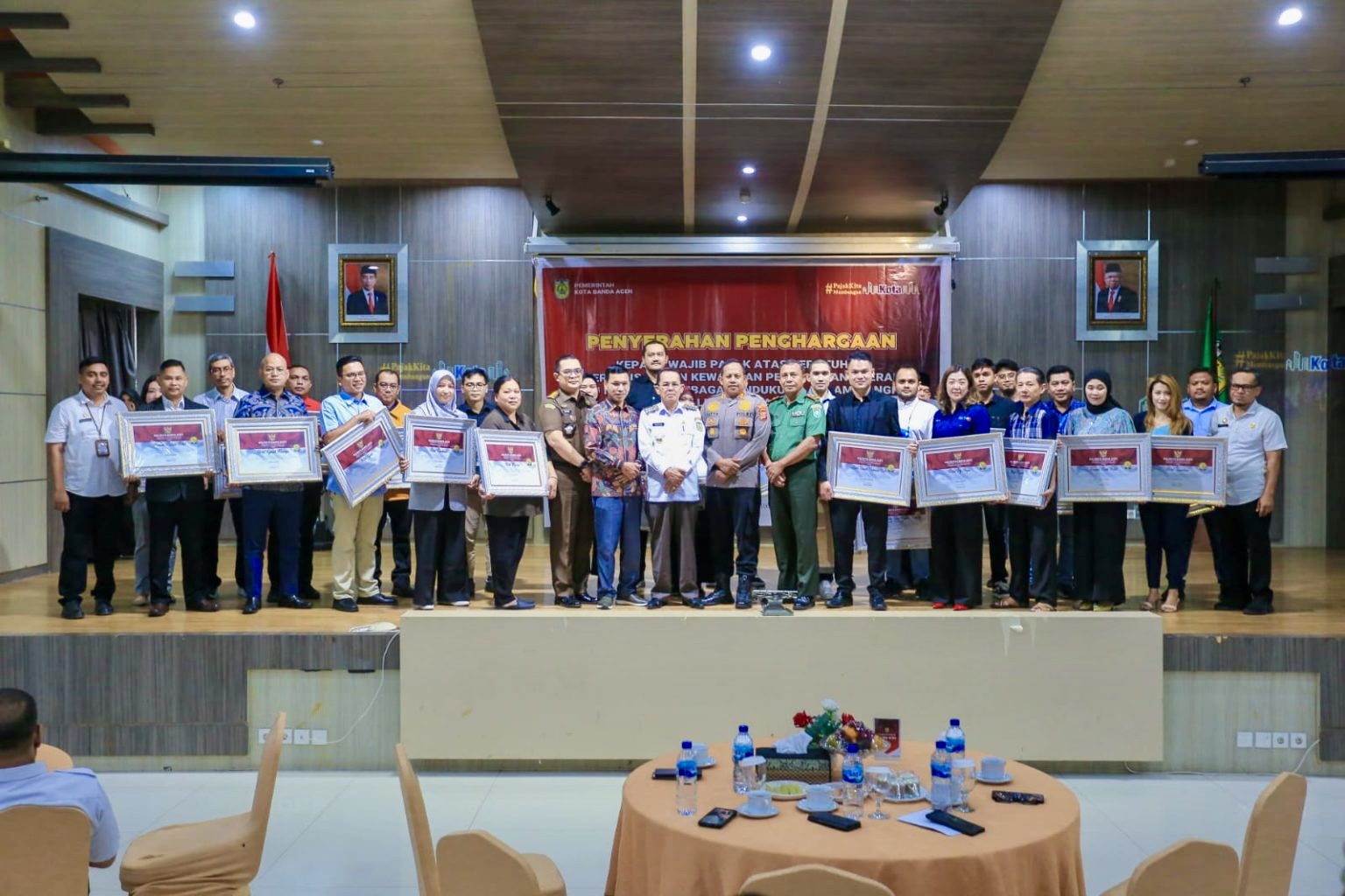BANDA ACEH – Pj Wali Kota Banda Aceh, Amiruddin SE MSi menyerahkan piagam penghargaan kepada 30 wajib pajak yang dinilai patuh dalam merealisasikan kewajiban perpajakan daerah.