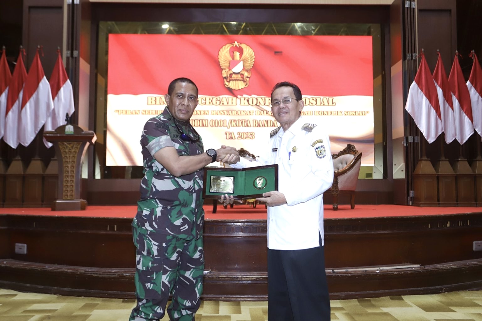 BANDA ACEH – Penjabat (Pj) Wali Kota Banda Aceh, Amiruddin SE MSi menghadiri acara “Pembinaan Komunikasi (Binkom) Cegah Konflik Sosial” yang diselenggarakan oleh Kodim 0101/KBA Kota Banda Aceh di Anjong Mon Mata, Rabu, 15 November 2023.