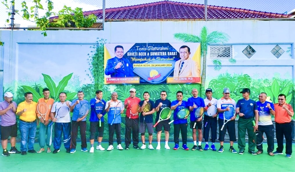 BANDA ACEH – Suasana hangat mewarnai kediaman Aminullah Usman di kawasan Lampaseh Aceh, saat Prof Ganefri PhD, Ketua Barisan Atlet Veteran Tenis Indonesia (BAVETI) Sumatera Barat, bersama rombongan dari Padang, berkunjung untuk pertandingan tenis eksibisi sekaligus silaturahmi.