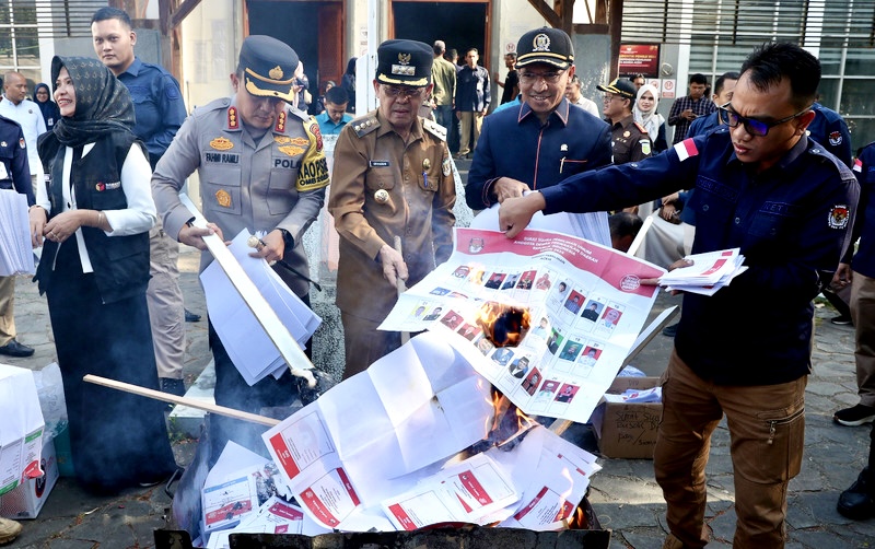 BANDA ACEH – Pj Wali Kota Banda Aceh Amiruddin bersama unsur forkopimda dan Komisi Independen Pemilihan (KIP) serta Panwaslih, memusnahkan 1.775 surat suara rusak dan sisa di halaman Gedung ITLC Banda Aceh, Selasa, 13 Februari 2024.