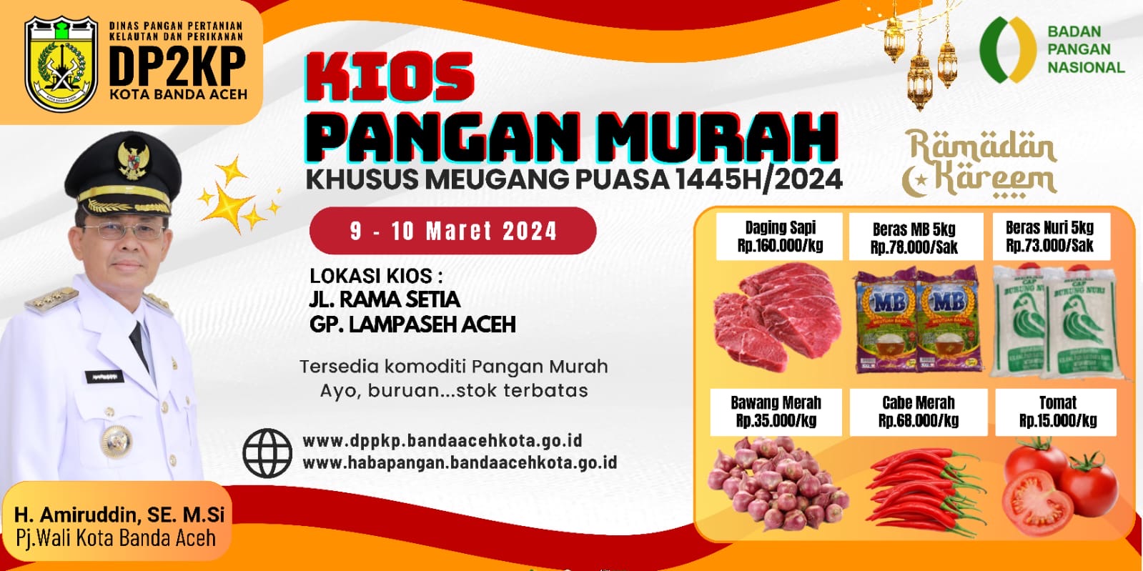 BANDA ACEH – Menyambut bulan suci Ramadan 1445 H Tahun 2024, pada meugang Ramadan tanggal 9 dan 10 Maret 2024, Pemko Banda Aceh melalui Dinas Pangan Pertanian Kelautan dan Perikanan Kota Banda Aceh membuka Kios Pangan Murah dengan menyediakan bahan pangan murah berupa daging sapi, bawang merah, cabai merah dan tomat yang di jual dengan harga lebih murah dari pada harga pasar.