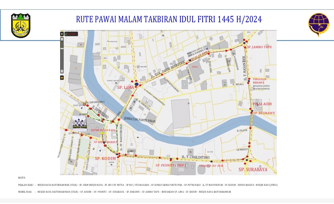 BANDA ACEH – Rute resmi untuk Pawai Takbir Keliling Idul Fitri 1445 H di Banda Aceh telah ditentukan melalui rapat yang diadakan pada Senin (8/4/2024) di Mapolresta Banda Aceh.