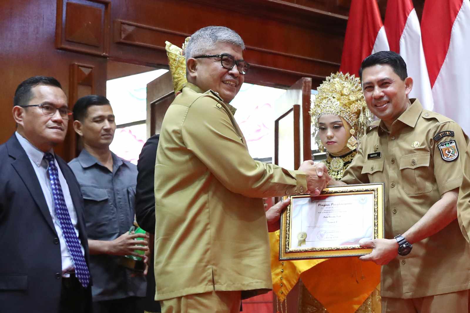 Penghargaan diserahkan langsung oleh Pj Gubernur Aceh, Bustami Hamzah kepada Pj Wali Kota Banda Aceh yang diwakili oleh Pj Sekretaris Daerah Kota Wahyudi di Anjong Mon Mata Banda Aceh, Senin (22/4/2024).