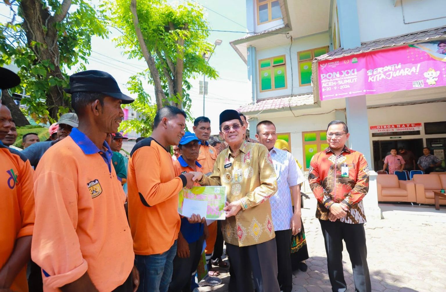 BANDA ACEH – Pj Wali Kota Banda Aceh Amiruddin menyerahkan secara simbolis zakat untuk para mustahiq. Kali ini diserahkan untuk 603 petugas kebersihan, yakni tenaga harian lepas Dinas Lingkungan Hidup, Keindahan dan Kebersihan Kota (DLHK3) Banda Aceh dan petugas harian lepas PUPR.