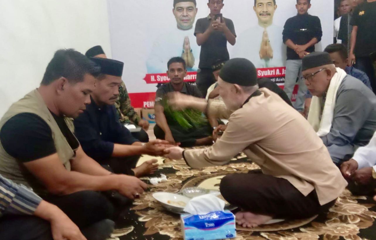 Disana, paslon perubahan H Syech Muharram dan H Syukri A Jalil juga peusijuk oleh para tokoh ulama Kota Jantho, Minggu, 13 Juli 2024.