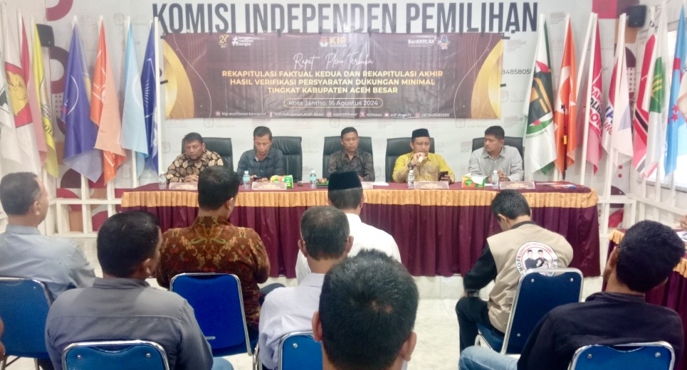 ACEH BESAR – Komisi Independen Pemilihan (KIP) Aceh Besar mengelar Rapat Pleno Terbuka Rekapitulasi akhir Hasil verifikasi persyaratan dukungan minimal bakal pasangan calon bupati dan wakil Bupati Aceh Besar. Rapat yang dihadiri seluruh anggota Komisioner KIP Aceh Besar dibuka secara resmi oleh Ketua KIP Aceh Besar T. Khairul Salim, berlangsung di aula KIP Aceh Besar Kita Jantho, Jumat, 16/08/2024.