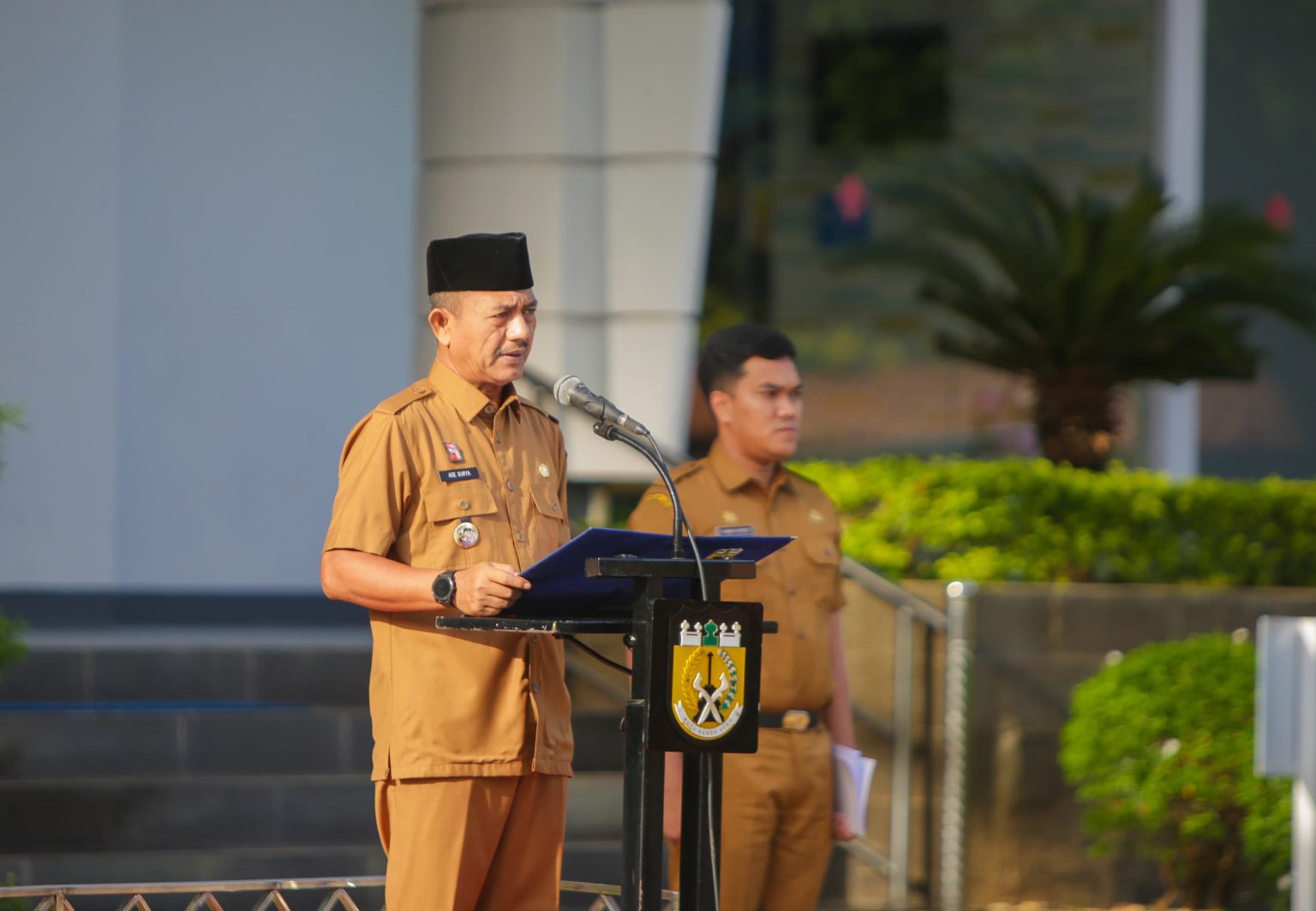 BANDA ACEH – Penjabat Wali Kota Banda Aceh Ade Surya bertindak sebagai pembina apel gabungan Aparatur Sipil Negara (ASN) Pemerintah Kota Banda Aceh di halaman balai kota, Senin, 7 Oktober 2024.
