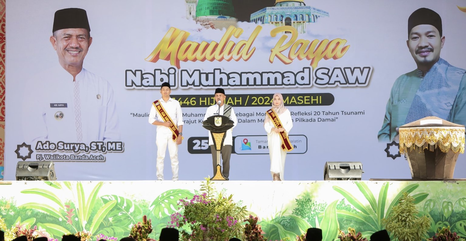 Dalam sambutannya, Pj Wali Kota Ade Surya menyebut tema perayaan Maulid Nabi Muhammad SAW tahun ini adalah “Maulid Raya Nabi Muhammad SAW sebagai Momentum Refleksi 20 Tahun Tsunami Aceh untuk Merajut Kebersamaan dalam Mewujudkan Pilkada Damai.”