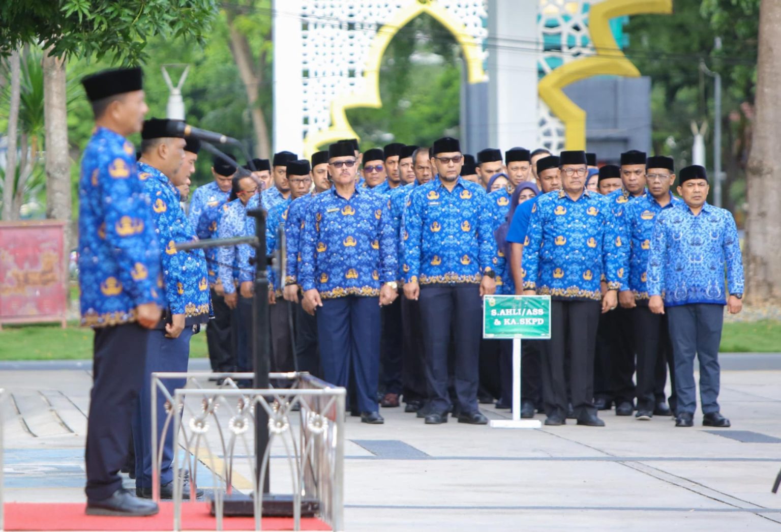 BANDA ACEH – Penjabat Wali Kota Banda Aceh Ade Surya bertindak sebagai pembina apel gabungan Aparatur Sipil Negara (ASN) Pemerintah Kota Banda Aceh di halaman balai kota, Senin (2/12/ 2024).