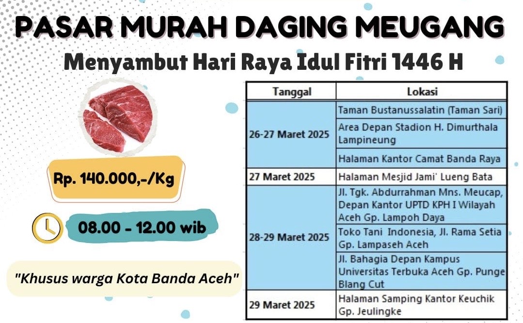 BANDA ACEH – Pemerintah Kota Banda Aceh melalui UPTD Rumah Potong Hewan (RPH) Dinas Pangan Pertanian Kelautan dan Perikanan (DP2KP) Kota Banda Aceh akan kembali menggelar Pasar Murah Daging Meugang menyambut Idul Fitri 1446 Hijriah. Pasar murah daging meugang ini akan digelar pada tanggal 26-29 Maret 2025 mendatang mulai pukul 08.00 – 12.00 WIB.