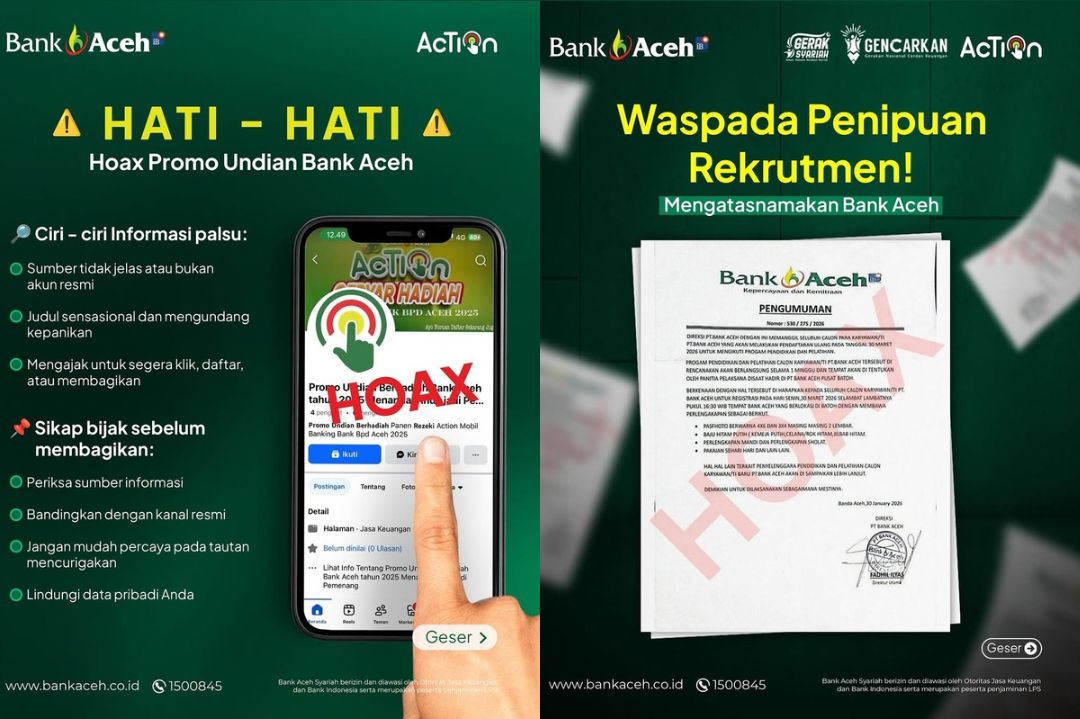 Pastikan informasi berasal dari akun media sosial resmi atau situs web Bank Aceh di alamat linkin.bio/bankaceh atau bankaceh.co.id, jangan pernah memberikan kode OTP, PIN, atau data perbankan kepada pihak mana pun dan jika ragu, segera hubungi saluran resmi Bank Aceh atau kantor Bank Aceh terdekat.