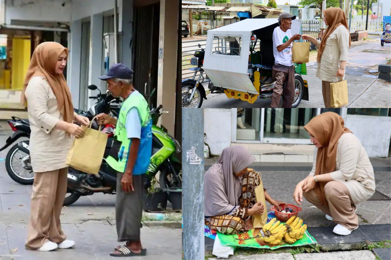 Aksi istri Gubernur Aceh ini cukup membuat para penerima terkejut. Perempuan yang akrab disapa Kak Na ini menyusuri kota menggunakan mobil dan berhenti jika melihat para petugas parkir atau pedagang kecil dan Abang becak.