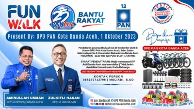 Pendaftaran dibuka 25 s/d 29 September 2023, 1000 pendaftar pertama mendapatkan baju BANDA ACEH –DPD Partai Amanat Nasional (PAN) Banda Aceh akan menggelar Fun Walk (Jalan santai) yang merupakan rangkaian…