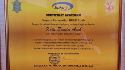 BANDA ACEH – Pemko Banda Aceh menerima Penghargaan Pencapaian Maturitas Sistem Pengendalian Intern Pemerintah (SPIP) Level 3 dari Badan Pengawasan Keuangan dan Pembangunan (BPKP). Penghargaan tersebut diserahkan pada acara rapat…